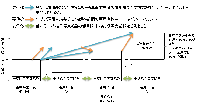 青色申告法人が平成25年4月1日から平成30年3月31日までに開始する各事業年度において、国内雇用者に対して給与等を支給する場合において、その法人の適用事業年度の雇用者給与等支給額が基準事業年度の雇用者給与等支給額に比して一定割合以上増加などの要件を満たしたときは、その雇用者給与等支給額の増加額の10%(税額控除限度額)を法人税額から控除(税額控除上限額:法人税額の10%(中小企業者等は20%)を限度)する制度です。