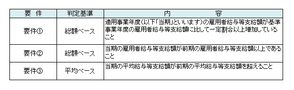 適用にあたっては、給与等の支給額に関して3つの要件があり、要件によって判定に用いる給与等の範囲が異なります(2.適用要件参照)。