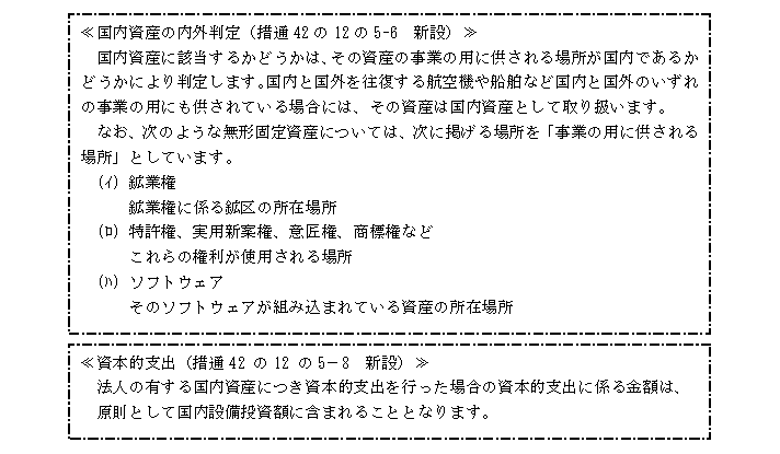 有するものの取得価額の合計額をいいます。取得等とは、取得又は製作若しくは建設をいい、合併・分割などによる取得は除かれています。また、オペレーティング・リース取引以外のリース取引に係る契約により取得した国内資産の取得価額を含むことになると考えられています。