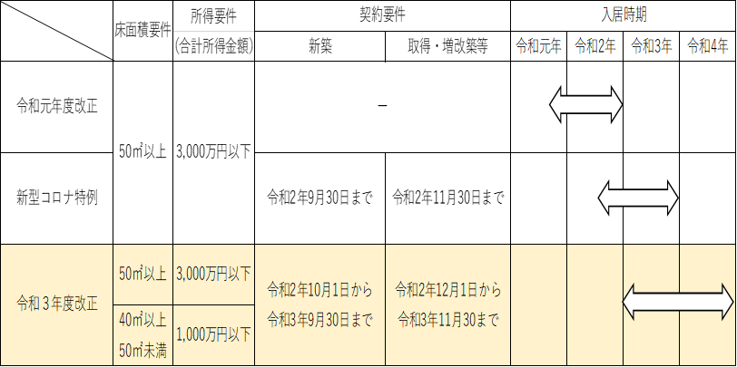 また、適用要件の1つである床面積についても50㎡以上から40㎡以上に緩和され、単身者向けのマンションや、狭い土地を活用した狭小住宅を取得した場合についても住宅借入金等特別控除の適用が受けられるようになりました。