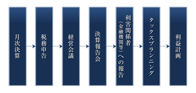 当事務所では、月次決算を軸に経営指導やタックスプランニングを行いながら適正な税務申告を遂行いたします。決算報告会を開催し、一事業年度の成果と反省を行い今期の決算内容を来期以降の経営に生かしていけるよう経営者の方々と話し合いを進めます。またご要望に応じて利害関係者、特に金融機関への決算報告もさせていただきます。