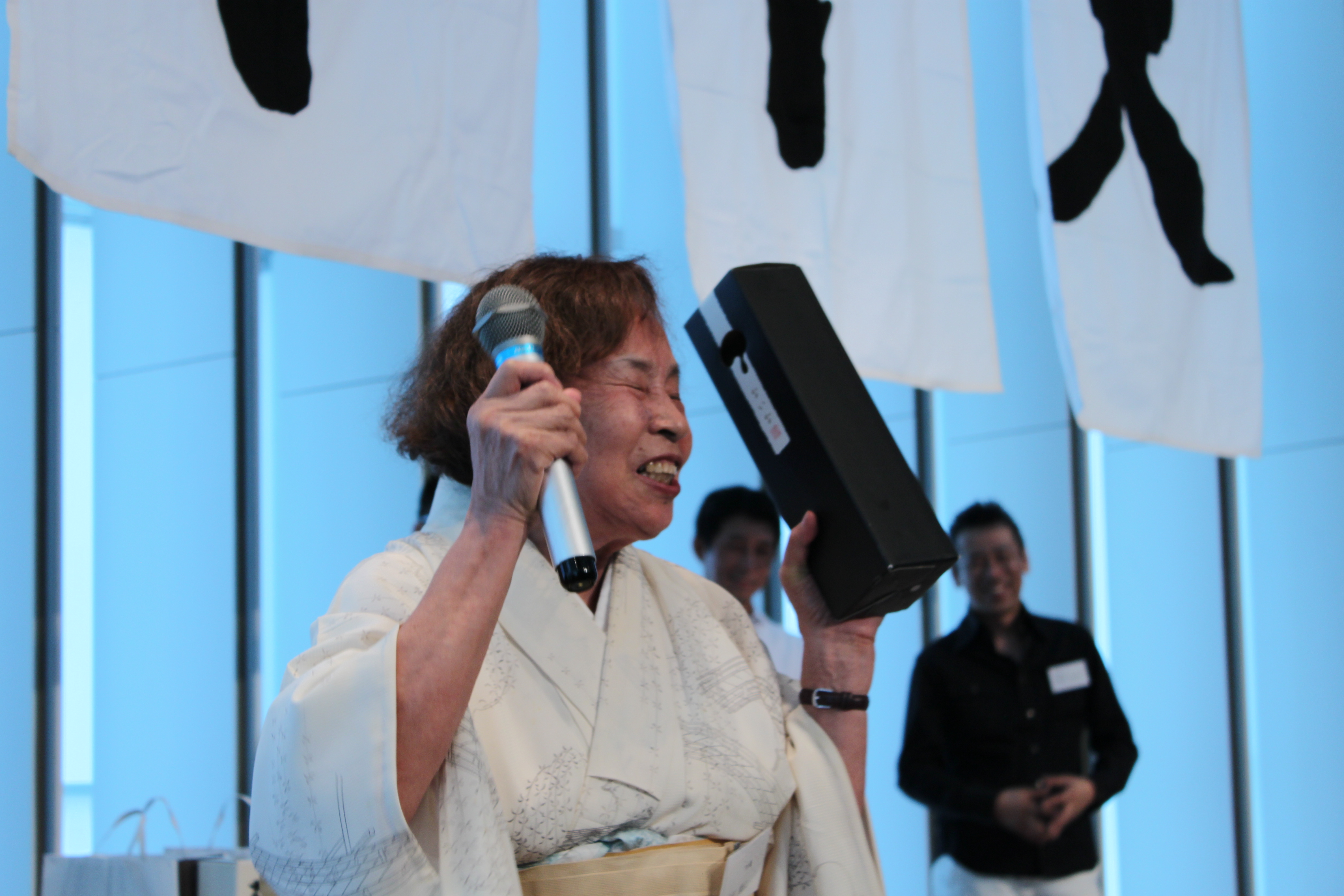 斯くして臨んだ関西支部総会、東京支部の総会もたった2回の参加経験しかない私ですが、僭越ながら両者を比較させて頂くと、まず関西の総会は東京よりも規模が小さいためか、それとも常連さんが多いためか、東京にはない「手作り感」や「ぬくもり」があるように思いました。例えば、会場に「今度〇〇の会がありますので、参加ご希望の方はここに名前を書いてください」というお知らせが掲示してあったり(思わず名前を書こうかと思いました!)、参加者の皆さんが懇親会の景品を持ち寄られていたり(“顔”が見える景品で当選した方も嬉しそう)、同じテーブルの方もそれ以外の方も顔なじみの様子で気軽に声をかけ合っていてその和気あいあいとした雰囲気のおかげで初顔の私もすっかり楽しませて頂き、今後も時々関西の総会にもお邪魔したいなと本気で考えているくらいです。“特別講演”があるのもいいですね!臨床心理士の井上先生のお話、なるほど~と頷きながら聞かせて頂きましたし、在校時に教わった友永先生のお話には、高校時代の音楽の授業に戻ったような懐かしい気持ちにさせられました。